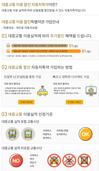 해당 특약은 현쟁 KB손해보험만 존재하고 있습니다. 대중교통 이용실적이 6만 원 이상인 경우 5%, 12만 원 이상인 경우 8% 할인되며, 부부명의로 가입할 경우 해당 실적 금액은 배로 달성해야 할인율이 적용됩니다.