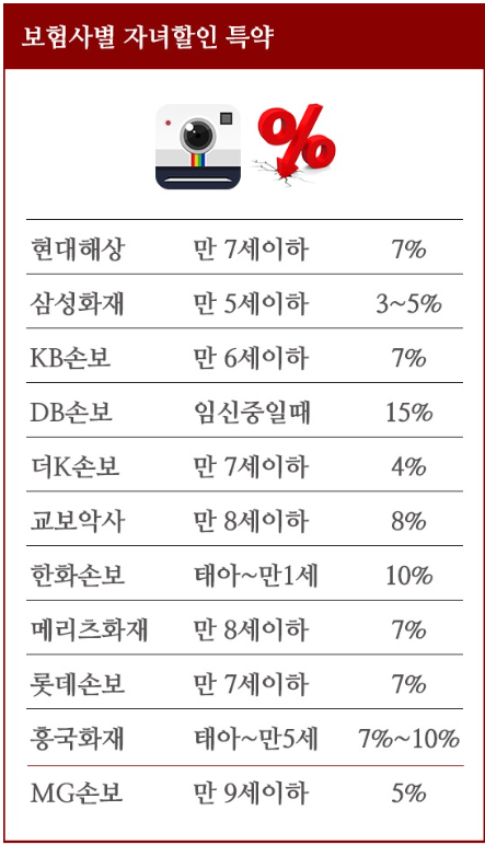 • 자녀할인특약 최대 6% (만 7세이하 6%, 만8세~만12세 3%, 만13세~만15세 이하 2%)