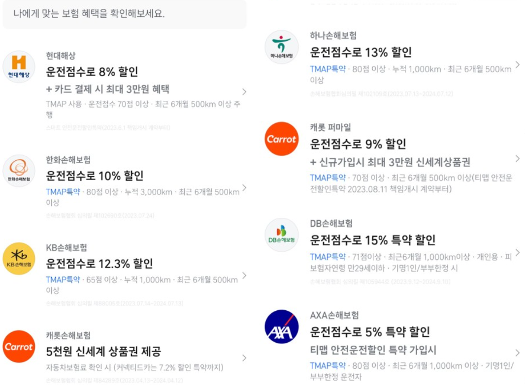 • 티맵 안전운전 80점이상 10%특약할인(1인 또는 부부한정, 최근6개월 500km + 누적 3,000km이상, 커넥티드카 안전운전 할인 특약 중복가입 불가)